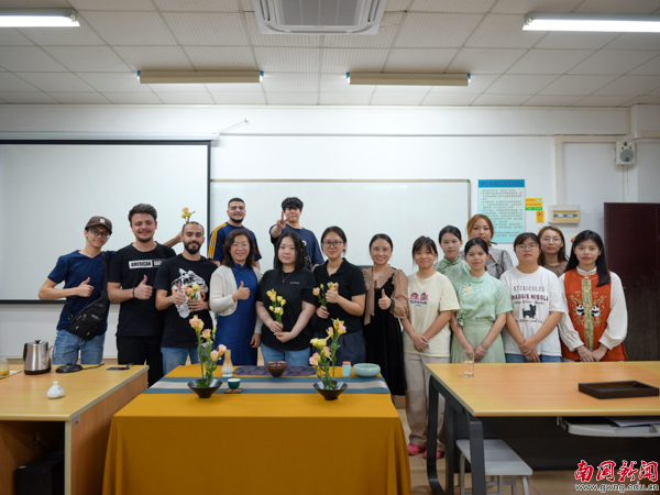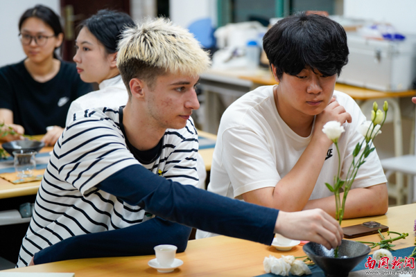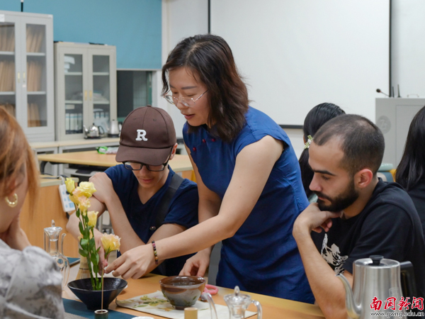 以点香为引,蔡海云老师娓娓道出焚香、点茶、插花的技艺。她邀请中外学生们合作完成各组的插花作品,装点桌面。在这过程中,蔡老师还特地为每位同学沏制了一杯花茶,三种不同的香气交织,弥漫在教室内,仿佛让人置身于仙境。同学们细细品味着空气中的芬芳,品味着宋代文人的雅致生活。