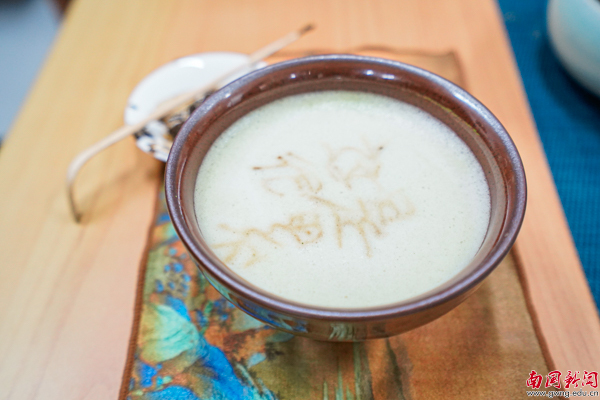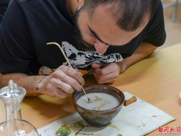 点茶完毕,就可以在茶面上“作画”了。此刻,同学们热情高涨,跃跃欲试,留学生们更是主动向中国学生请教要点。其中一名留学生别出心裁地在茶面上,分别用家乡的阿拉伯字体与汉字书写下“中国”二字。这份创意不仅展现了他对学校的深厚情感,更凸显了他对中国及中国茶文化的深厚热爱。蔡老师对每位同学的作品一一进行点评,并给予了高度的赞赏。得到老师的肯定后,留学生们激动不已,尽管中文表达尚显生疏,但他们仍努力用中文向蔡老师表达衷心的感谢,现场氛围温馨而融洽。