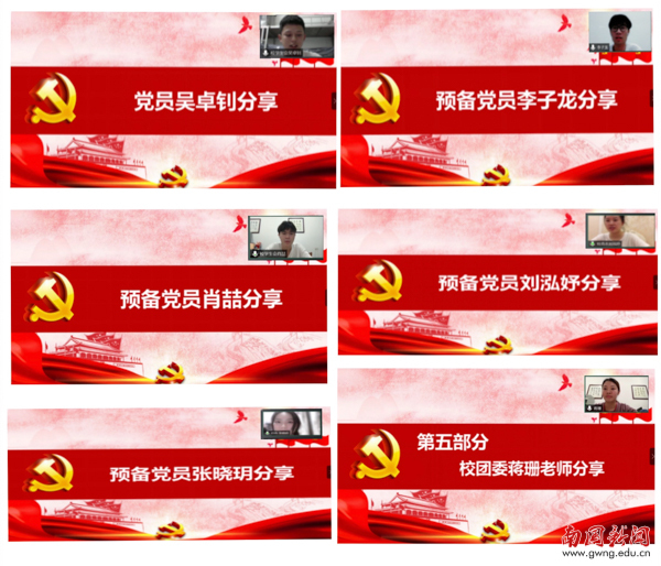 师生在会议中分享了自己的成长故事和在党史学习中的感悟。吴卓钊同学表示从成为一位光荣的共产党员以来,他在思想、学习、工作、生活等方面时刻严格要求自己。“纸上得来终觉浅,绝知此事要躬行。”他呼吁同学们在学习书本知识的同时,要重视社会实践与志愿服务活动,努力以“全心全意为人民服务”的宗旨做好各项工作。李子龙同学认为作为新时代的青年要做到以下四个方面:一是思想积极向上,积极向党组织靠拢;二是恪守学生本分,认真学好专业知识;三是工作认真负责,始终坚持服务同学;四是热衷课外活动,丰富社会实践经历。肖喆同学分享在成长历程中长辈对他的影响,在他所在的屋子大门旁鲜红的铭牌边确立了入党的想法。在以后的日子里,他将会继续努力学习党的知识、使命和精神,以党员的标准来要求自己。同时,他希望同学们可以做到心中有火,眼里有光,在这个光荣的集体中发光发热,为国家和社会做出自己的贡献。刘泓妤同学谈道,入党过程的实质就是认识党、热爱党、发展党和捍卫党。她总结了自身的优缺点,希望通过不断完善自己,早日成为一名合格的共产党员。张晓玥同学分享了成为预备党员的一些感悟,在回顾入党的历程时,很荣幸遇到一群志同道合的伙伴与她在成长的道路上携手共进,在今后的生活中,她将积极践行自己的入党初心,争取早日成为一名新时代的优秀共产党员。