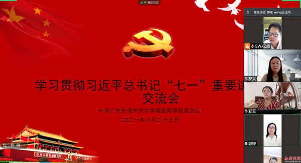 本网讯 8月23日上午,学校在线上平台召开党委中心组党史学习体会交流会议。学校党委副书记付鸿信,党委组织部部长黄汉成、党委教师工作部部长王琳琳、管理学院党总支书记郭婷、旅游学院副院长陈书星、英语语言文化学院党总支书记高彩云、思政部教师郝文等7位同志,就近期深入学习贯彻习近平总书记在庆祝中国共产党成立100周年大会上的重要讲话(以下简称“七·一”重要讲话)精神作了详细的学习体会分享。省委教育工委党史学习教育第二巡回指导组联络员胡玲娟,校领导,各部门、各学院副职及以上干部、学校党史学习教育领导小组成员等60余人参加会议。学校党委书记、副校长许志超主持会议。