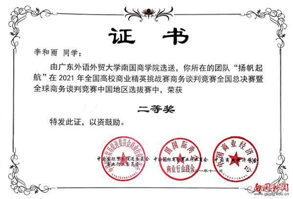 该竞赛是由中国国际贸易促进委员会商业行业委员会、中国国际商会商业行业商会与中国商业经济学会主办,面向在校大学生的综合性商科类专业竞赛。本次竞赛经过校内知识赛和全国地区选拔赛选拔,最终有来自全国60多所高等院校171支参赛团队,近1200位辅导教师和参赛选手进入全国总决赛。晋级全国总决赛的团队通过直播抽签分组确定商务谈判的持方,并在组委会指定平台进行线上视频谈判,最终评委根据线上视频谈判进行打分和评选。雷竞技官网共有36人通过校内知识赛,经过层层选拔,最终“扬帆起航”队进入全国总决赛,并取得了二等奖的好成绩。