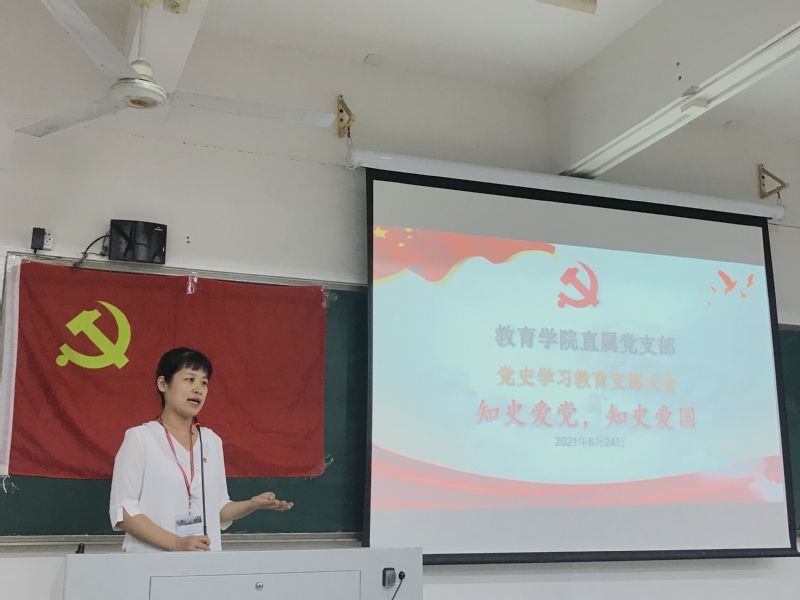 2021年6月24日下午,教育学院直属党支部在F106召开党史学习教育支部大会——学习中国共产党百年党史,知史爱党、知史爱国,会议由教育学院直属党支部书记徐燕萍同志主持。参会人员包括教育学院正式党员、预备党员和发展对象。