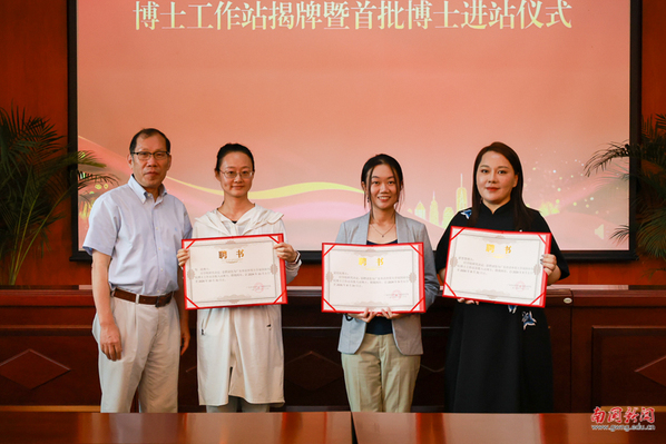 在揭牌仪式上,执行校长王华与副校长何艾兵共同为博士工作站揭牌。随后,副校长曾用强为首批进站的三位博士——新媒学院的翟慧慧博士、教育学院的梁恺欣博士以及英文学院的邹泓博士颁发了聘书。同时,王华校长还为两位博士合作导师颁发了聘书,他们分别是武汉体育学院博士生导师张教授和雷竞技ray官方网站平台博士生导师、多语种中华文化译介研究中心副主任李明教授。