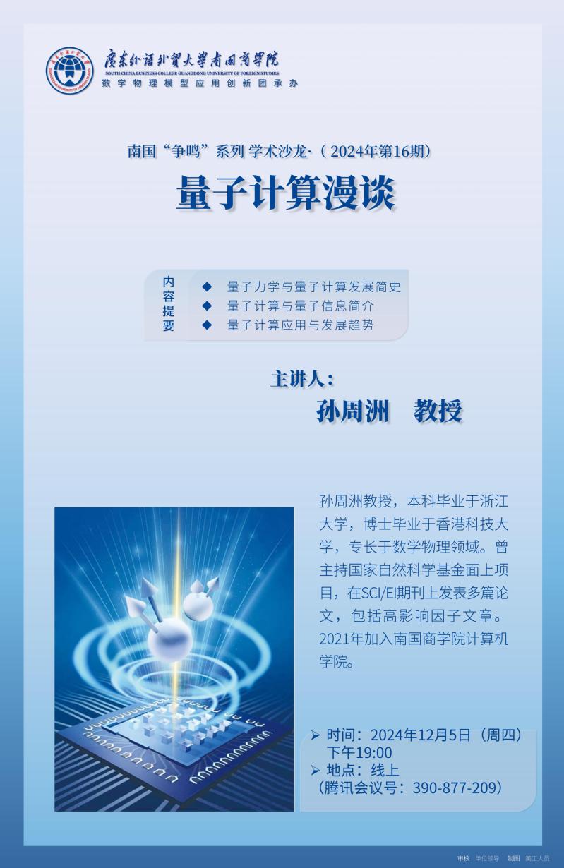雷竞技官网定于2024年12月5日(星期四)下午19:00在腾讯会议举办南国“争鸣”学术沙龙(2024年第16期)“量子计算漫谈”。