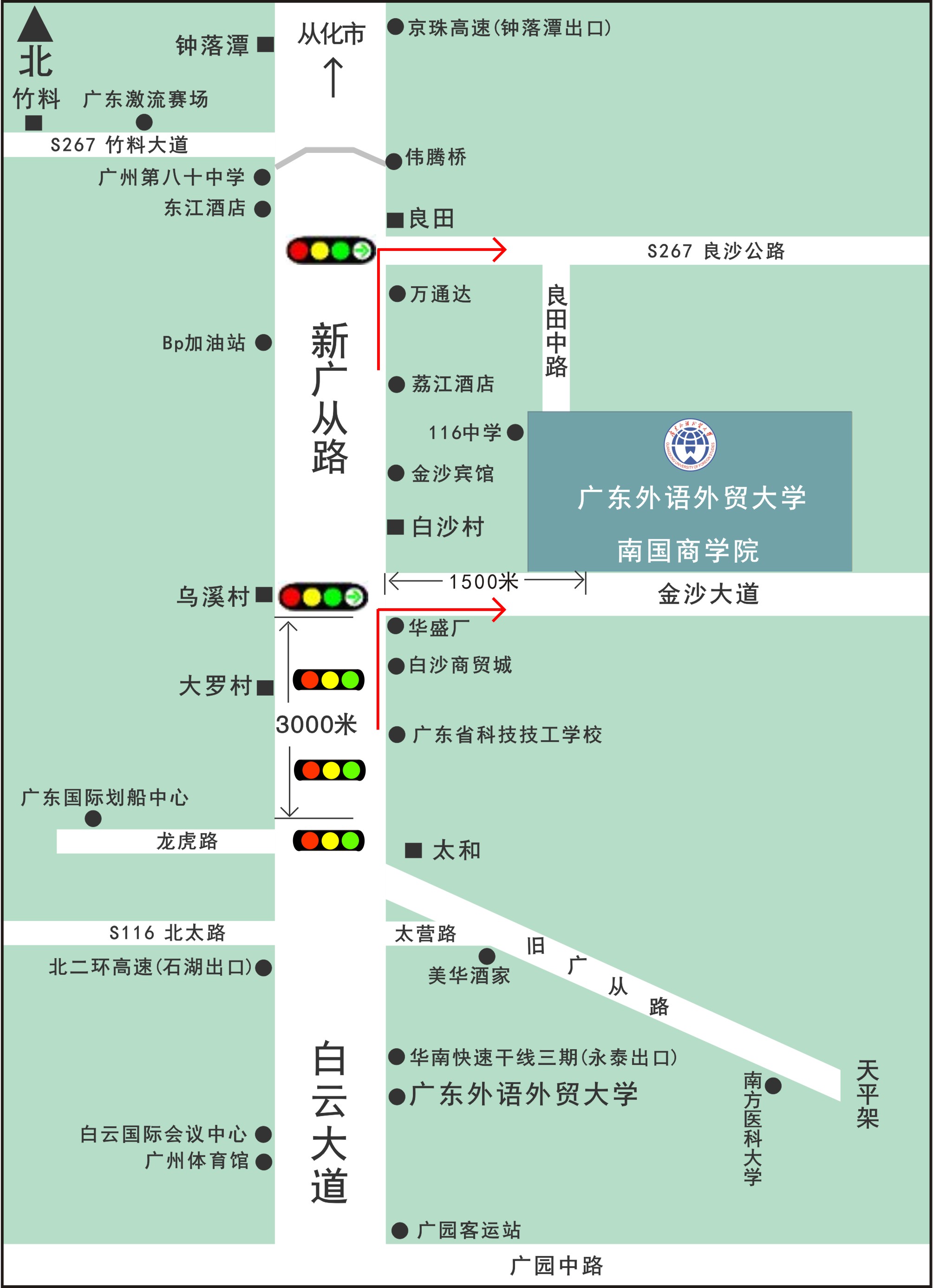 (2)沿天平架沙太路向北开,经过太和镇,并入105国道新广从公路(广州往从化方向,太和至竹料路段),经过广东国际划船中心红绿灯路口后,继续往前约2.4公里第三个红绿灯处右转,穿过白沙商贸城直入约1.5公里到达学校正门。