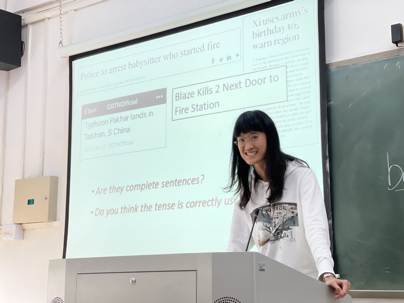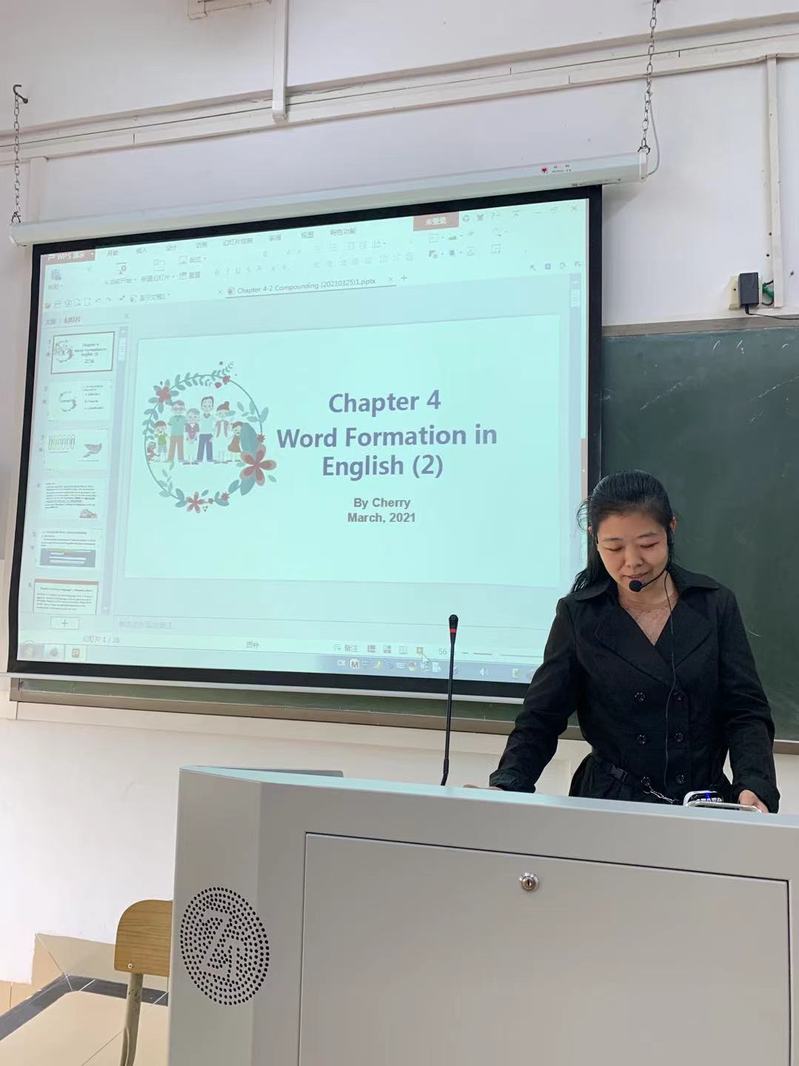 兰玉老师为《英语写作》主讲教师,她采用提问的方式进行了导入,引导学生思考如何描述人变老过程中的各个方面的变化,并选用了经典例文进行段落逻辑结构的分析。其课堂讲解内容详尽,准备充分,逻辑性强。张群芳老师的授课内容为英语合成词,其授课目标非常明确,例子生动有趣,紧跟时代发展,课堂讲解耐心细致深入;李潇老师的语音语调非常漂亮,她通过图片等方式吸引学生的兴趣,并结合时事举例阐述如何正确表达自己的观点,对重难点词汇的讲解详细清晰,课堂生动活泼,互动性强;陈嘉老师以英语新闻报道的标题为讲授主题,分析了新闻标题的特点,内容充实,主题明确,且通过实时练习的方式加强互动,激发兴趣,与在场的老师之间形成了互动,课堂气氛非常活跃。