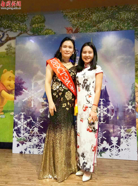 刘媛媛(右)在学校年终晚会上身着旗袍与同事合影