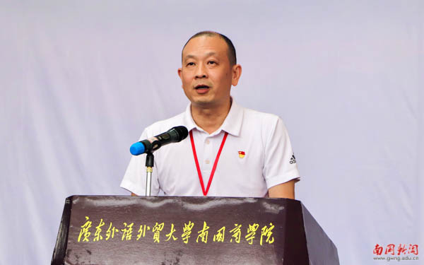 黎冬致开幕辞。他说,龙舟比赛最让人心动的是合作与竞争,只有齐心协力才能产生最佳合力,让龙舟勇往直前,这是团队之间精神、心理等方面的全面较量。他说,今年是祖国70周年华诞,学校希望借助赛龙舟这项运动,通过“同舟共济、团结拼搏、奋勇争先”的龙舟精神感染全校每一位师生员工,使之成为深入人心的校园文化。