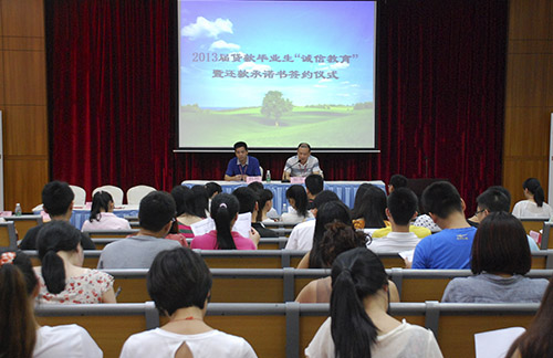 本网讯 (记者 钟春鹏)6月21日,学校在学术报告厅F101举行2013届贷款毕业生“诚信教育”暨还款承诺书签订仪式。党委书记黎冬出席仪式。仪式由学生处处长杨林主持。