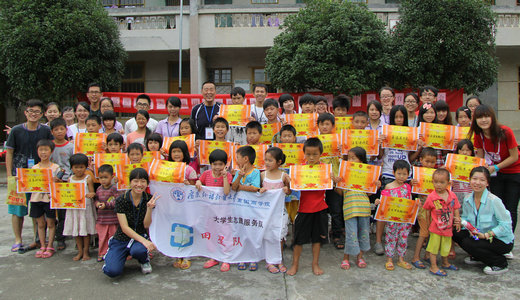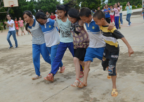 上午九时,运动会在教学楼前的篮球场正式开始。为了确保小学生的安全和运动会的有序进行,体育委员郭锦源还特意为同学们上了一堂安全教育及赛前热身课。运动会的项目都由支教老师们精心准备,包括“糖果传情”、“二人三足”等十几个比赛项目。趣味运动会的目的并不是决出胜负,而是消除同学之间、志愿者与学生之间的陌生感,培养团队感情,增强团队协作能力,学会沟通合作。