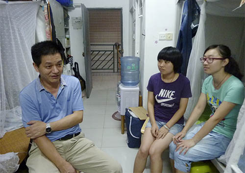 本网讯 9月12日晚,学生处处长杨林等一行到中文系大四毕业生宿舍走访,细心地解答毕业生提出的问题。