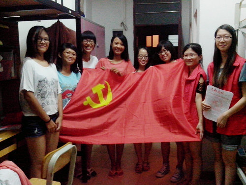 本网讯 9月15日晚,英语系第四学生党支部的党员带着党旗走进了英语系新生宿舍,对2013级新生进行党的基本理论知识的宣传教育工作。
