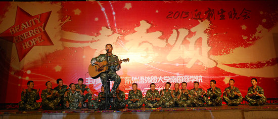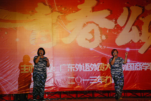一头如火的红短发,一身蓝白相间的迷彩服,这位2013级新生的霸气登台立即引发了现场的尖叫声。即便如此,如雷鼓般的欢呼声也不能盖过由其用浑厚的嗓音唱出的一曲《青藏高原》。同是一身海军装、2013级新生,作为另一位同台表演的她也毫不逊色地唱起了gaga的“bad romance”。台下的新生也扯开嗓门与台上的两位新生互动共唱一曲《我相信》。