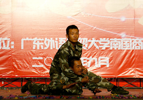 在新生们的热情呼唤下,教官们身穿绿色军装,踏着整齐的步伐出场,让新生们的热情瞬间爆发。教官们用矫健的英姿为新生们带来《花样倒弓》的表演,特别是最后表演的三人搏击,他们利落敏捷的身手让新生们大开眼界,叹为观止。