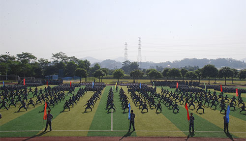 由340名女生共同表演的匕首操与女子防身术,则展现出了不同的女子气概。在阳光照耀下,亮闪闪的匕首在她们手中准确到位地共同挥舞,场面十分震撼,散场时,她们齐声喊出校训:“明德尚行,学贯中西”。
