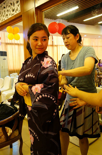 金子老师帮同学们穿和服(肖玥 摄)