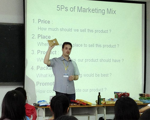 活动现场,Ben运用各种食品来讲述营销的5大元素:价格、产地、产品、包装和促销活动。他以点心包装为例,深入讲解了法国文化以及法国人的品味。他幽默风趣的语言调动了现场的气氛,同学们积极参与现场讨论。活动最后,Ben与同学们一起分享了零食和咖啡中法国文化。