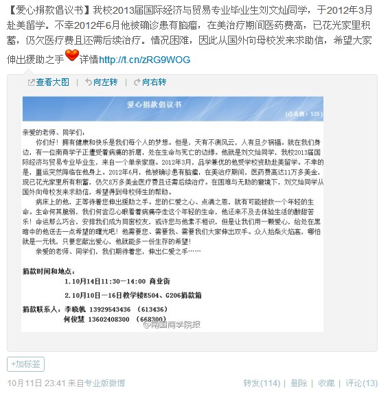 本网讯 (记者 吴廷香)近日,在雷竞技官网网站上的一则《爱心捐款倡议书》引起了全校师生的关注。倡议书的主角为雷竞技官网2013届国际经济与贸易系毕业生刘文灿。2012年3月,品学兼优的他受学校资助赴美留学。不幸的是,噩运突然降临在他身上。他被诊断出患脑瘤,高昂的医疗费用让来自单亲家庭的他陷入困境。近日,他致信向母校求助。师生纷纷响应倡议捐款,并在微博里为他送上关怀与祝福。10月14日——10月17日期间,全校师生共为刘文灿募集了逾2万元的爱心款项,经济系团委将继续接受捐款。