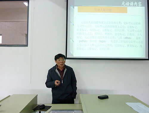 本网讯 12月5日下午,英语语言文化系主任李发根教授在G210为师生主讲了一场题为“元话语分析”的讲座。