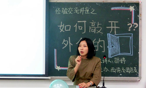 本网讯 12月10日下午,西方语言文化系邀请2012届法语专业校友邵婷在教学楼F102开展一场题为“如何敲开外企的门”的经验交流会。邵婷现就职于法国航空公司,担任空中翻译一职。她与同学们分享了大学生活规划及外企求职经验。