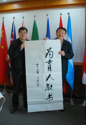 讲座开始前,王佐书在行政楼309室即席挥毫“为育人教书”5字赠与学校。(文、图/陈慧椅)