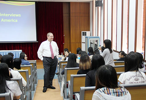 本网讯(记者 罗海东) 3月27日,主题为“美企面试技巧”的讲座在F101学术报告厅举行。美国驻穗总领事馆人力资源部官员Michael Cragun担任主讲人。
