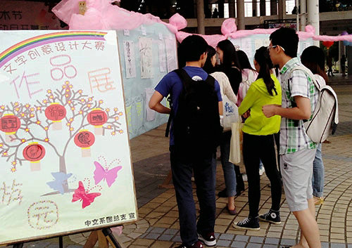 “文字创意大赛”是由中文系团总支首次举办。面向全校学生征集作品,入选作品经老师评选,最后加上活动现场学生投票,最终评比选出前3名。为了避免部分学生重复投票,确保公正性,中文系首次采用实名制投票。在商业街活动现场,入选“文字创意大赛”的10组优秀作品和8组参赛作品均在展板上展示。同学们充分发挥创意,别出心裁地设计文字的造型。