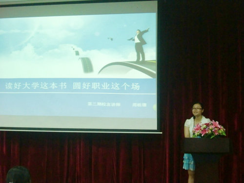 周桂珊现就职于广东志高空调有限公司担任《镜刊》主编,同时担任学校佛山校友会副会长。她与同学们分享了自己的大学生活和现在的工作状况。