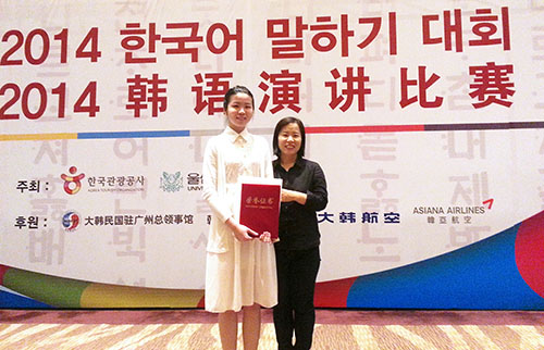 本网讯 5月24日,东方语言文化系2012级朝鲜语专业陈嘉庆同学参加了韩国旅游发展局演讲比赛。朝鲜语专业部分老师及40名同学观看了比赛。最终,陈嘉庆同学与中山大学学生并列第四名,获得奖品中韩往返飞机票。