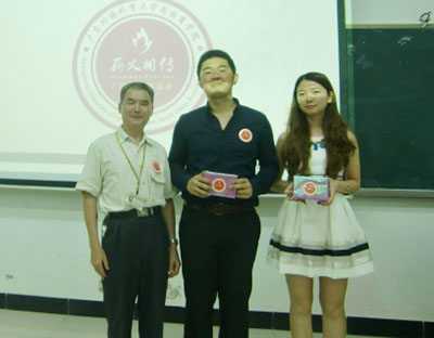 本网讯 5月29日下午,“南国薪火”校友服务中心第15场校友讲座在G103举行。2009级商务全英专业校友邓哲、2009级西班牙语专业校友潘捷彤返校传授经验,解读“认知自我,做幸福的前进者”。思政课教学部教授黄启乐出席讲座。