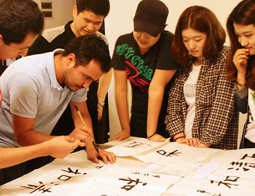 书法课上,留学生们在课前就已备好笔墨宣纸,并用中文向授课的老师介绍:“你好!老师!我带来了毛笔”。对于这门此前没有接触过的写字艺术,留学生们体会不一。不熟悉中文的墨西哥留学生Gabriel感叹道,“书法就像画画一样,要求连贯和美观,我还需要多加练习。”韩国留学生金完洙表示,在他看来,写书法的时候不能随便乱动,感觉像在做运动一样,必须要全身贯注才能完成。