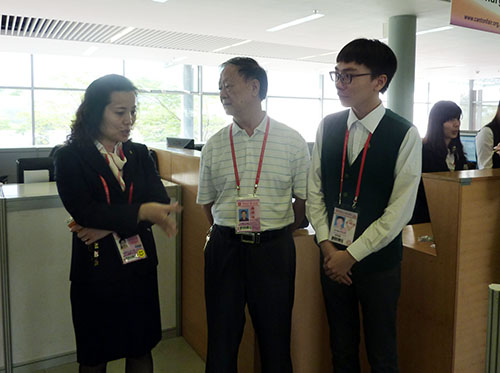 游新宇(中)在广交会向企业负责人了解学生情况 (资料照片)