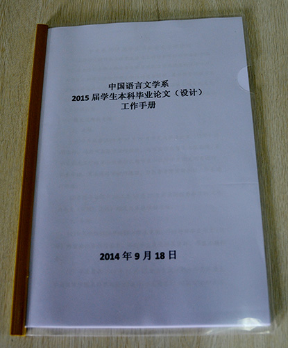 本网讯 为了做好2015届毕业生本科毕业论文工作,日前,中国语言文学系特别制作了《中国语言文学系2015届学生本科论文(设计)工作手册》(下称《工作手册》)。指导教师人手一本,电子版上传学生QQ、微信群。