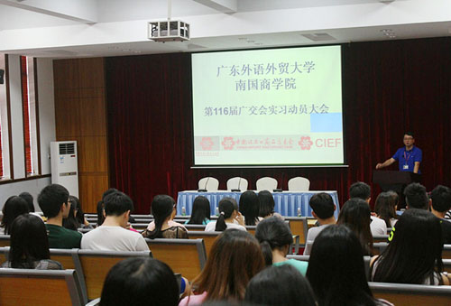 袁长青讲话,他指出实践教学是育人的重要环节,雷竞技官网致力于培养理论与实践结合的应用型人才,广交会是一个很好的实践平台,他希望同学们能把理论知识应用到实践中去,通过实践对自己所学的专业有一个较为全面的认识,并为将来的就业和深造积累经验。袁长青赞扬了以往雷竞技官网实习生在广交会上的优秀表现,呼吁同学们继承和发扬他们的精神,展现南商学子的风采和精神风貌。