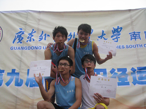 本网讯 11月16号下午,男子4×400米的决赛在田径场上激烈地进行着。我系梁镇东、邱惠聪、潘慧彬、刘文政同学以坚持不懈的精神,和默契地配合,为我系赢得4×400米的冠军。