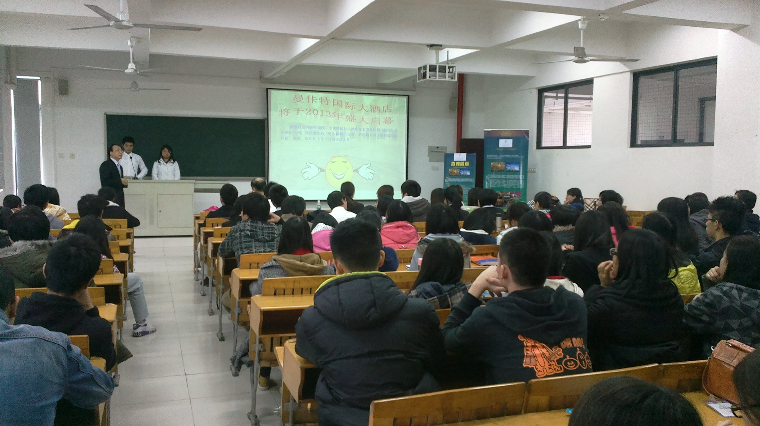 东莞曼佧特国际大酒店人力资源总监王先生介绍了该酒店的发展情况和主要设施,并为同学们讲解了酒店职业生涯的发展道路,以及高星级酒店对管理人才的要求和条件。最后,王总还一一解答了同学们所关心的酒店就业及待遇、酒店就业的晋升空间、酒店的员工培训与考核机制、酒店的核心竞争力等一系列问题。