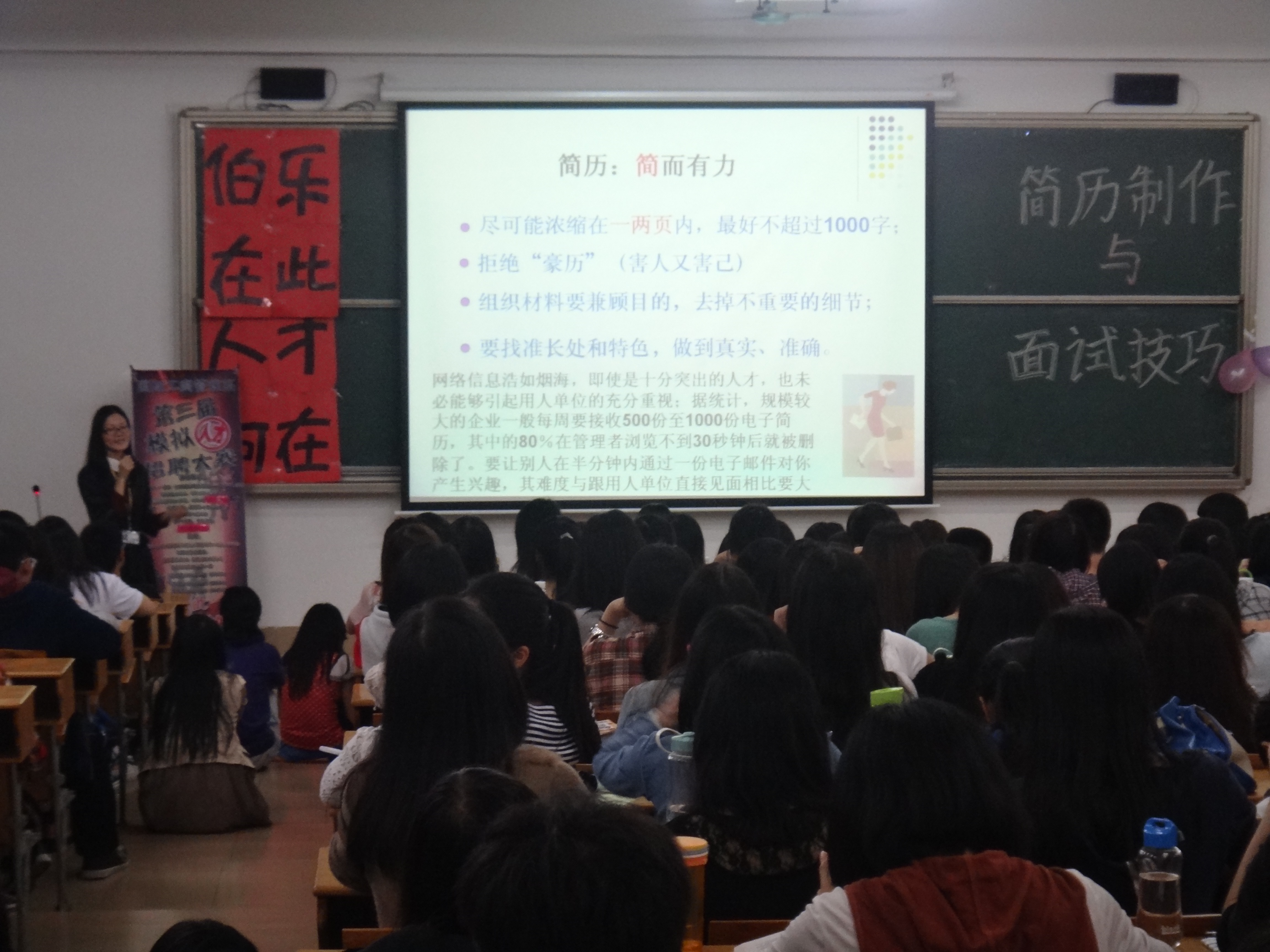 讲座在高涨的气氛中拉开帷幕,会场座无虚席。主讲人刘伟娴老师通过三个不同的方面述说了简历制作和面试的技巧。她详细地解剖了当下流行的简历制作形式,并结合生动的案例分析,让大家能深刻地了解在简历制作中存在的隐性问题,使同学们在往后制作简历中能做出适当的调整。