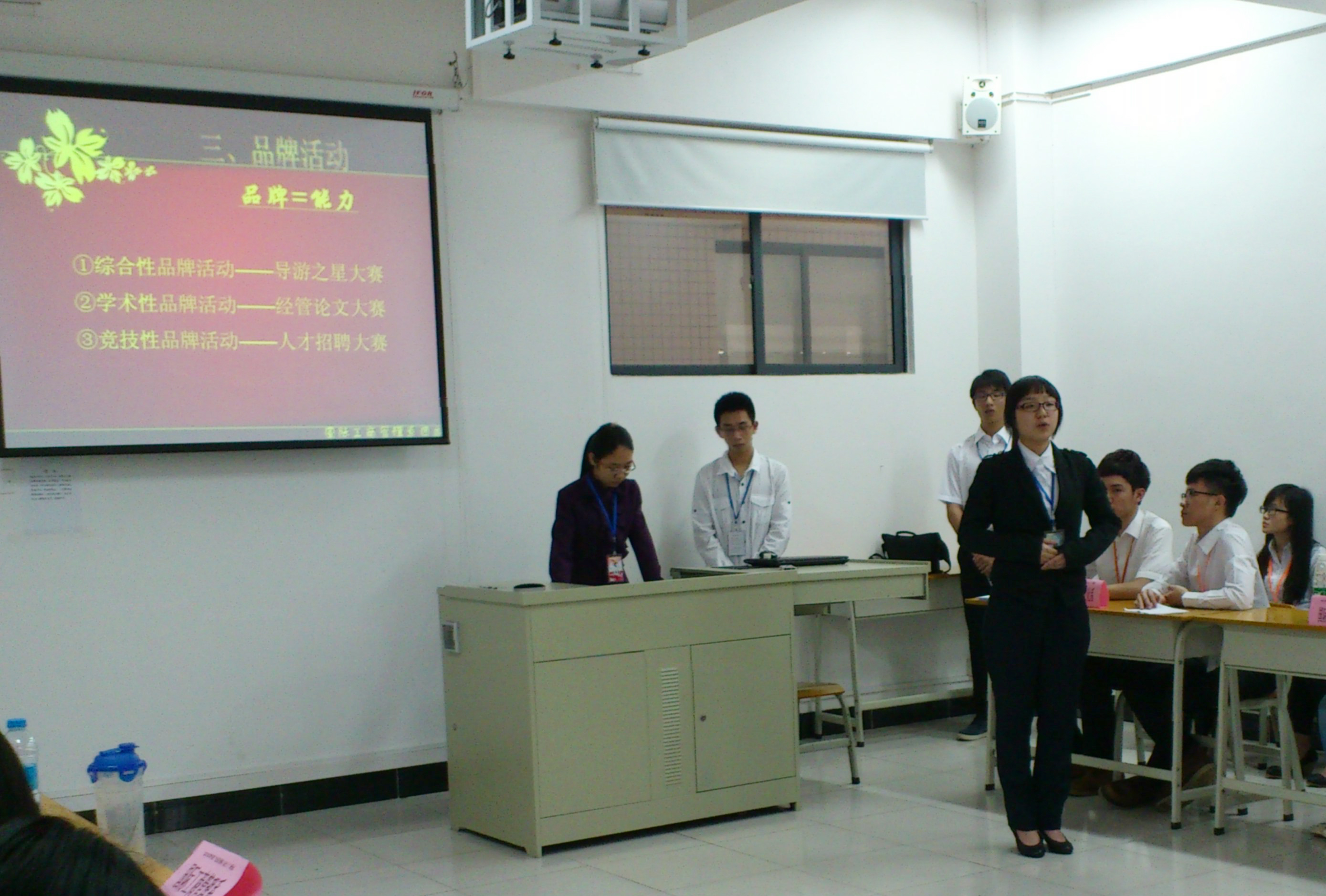 紧张而又严肃的氛围笼罩着整个评选会现场,在活动主持人的开场白后,“先进分团委(总支)”评选大会有序进行。首先,各个系团委干部代表分别进行八分钟的PPT风采展示。在接下来的评选会中不难发现,有一直坚持更高更快更强理念的英语语言文化系;有一语惊人,以西班牙语作为开场白的西方语言文化系;有坚持服务东语,服务南国的东方语言文化系;也有充满活力,富有朝气,敢于拼搏,敢于创新的国际经济贸易系。随后,国际工商管理系的代表展示了管理系团委的成果与成长,而它秉承的工作重心——“立德树人,服务成材”,也令人印象深刻。对于中国语言文化系而言,他们更注重的是团结与优秀团队的建设;而信息科学技术系用简单明了的语言详细地介绍了他们的特色,紧接着的是去年刚刚成立的金融系也坚信只要给他们一份肯定,他们会给我们十分精彩。