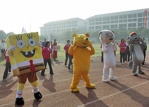 最具人气的莫过于我系教职工方阵队,灰太狼(陈国静老师饰)、喜羊羊(刘伟娴老师饰)、小熊维尼(温岚老师饰)和海绵宝宝(刘梦文老师饰)4位可爱的卡通人物前来助阵。管理系教师给大家带来一段欢快的兔子舞蹈,掀起本次开幕式的高潮。