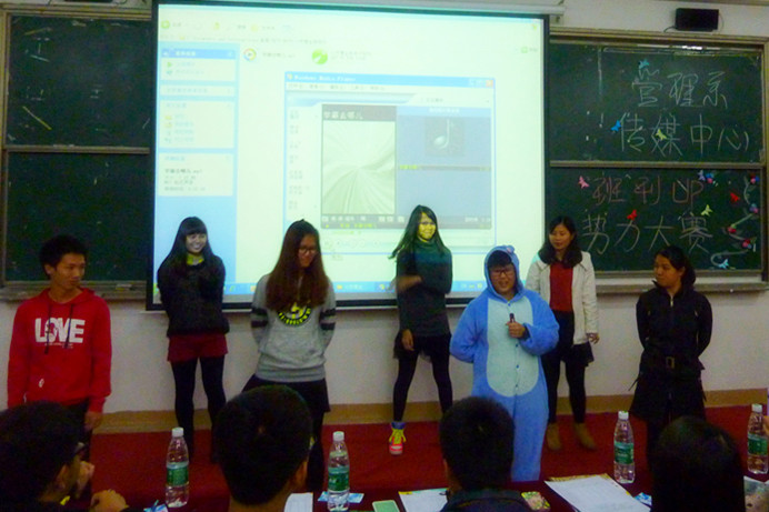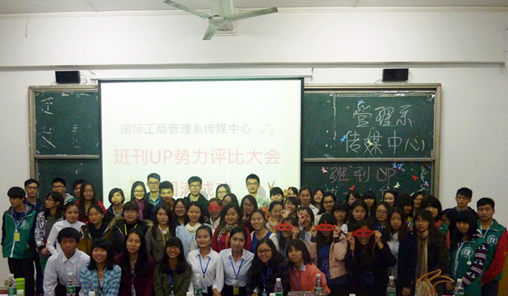 本网讯 11月27日晚,国际工商管理系传媒中心第五届班刊“UP”势力大赛在C302隆重举行。突如袭来的寒潮并没有影响大家激昂的热情,各参赛班级代表和亲友团早早就来到了大赛现场。出席此次大赛的嘉宾和评委有管理系传媒中心指导老师何思萍,管理系辅导员黄睿、刘伟娴、温岚、刘梦文和刘淳媛老师,以及管理系学生会主席徐嘉润、管理系团委主席魏迅鸿、管理系团委副书记吴铭茵、中文系传媒中心主任陈小菊。