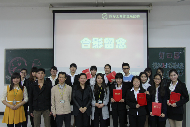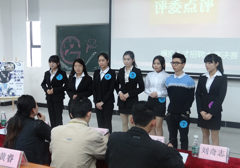 本网讯 为了让同学们通过实践演习,展示自我推销能力,积累应聘经验,3月20日下午,国际工商管理系团委于G104隆重举行了第四届模拟人才招聘大赛决赛。莅临本次比赛的嘉宾有:大学英语系讲师余志华,英语语言文化系教学秘书赵敏,管理系团委书记刘梦文,管理系学生会指导老师陈国静,管理系辅导员何思萍、张小玲、黄睿老师,广东发展银行客服经理梁达坚,第三届模拟人才招聘大赛季军吴伟键,管理系团委勤工中心前任部长徐惠芳,管理系团委副书记魏迅鸿。