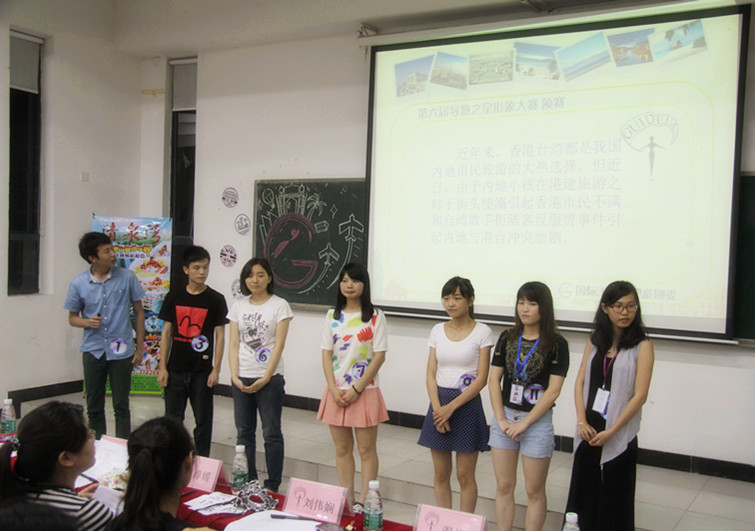 本网讯 为给学校旅游管理专业的学生提供专业技能的平台,同时更好地展现在校大学生激情飞扬的青春风采与勇于拼搏的优秀品质。5月15日晚,管理系团委在教学楼G107举办第六届“导游之星”形象大赛预赛。莅临本次预赛的评委有:管理系辅导员温岚、刘伟娴、刘淳媛、何思萍老师,管理系团委书记刘梦文,副书记魏迅鸿、吴铭茵,学生代表张正蕾、黄晓茵、崔洪月,以及各系代表的大众评委。