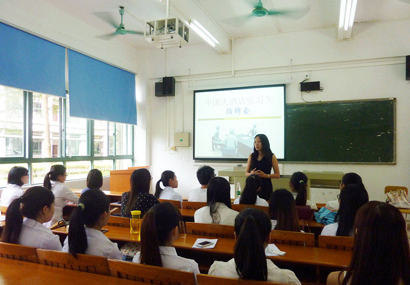 本网讯 9月22日下午,中国大酒店实习生招聘会在教学楼E栋105顺利举行,该会由中国大酒店人力资源部的经理和主管担任面试官,我院2011、2012级旅游管理专业的部分学生参与了本场招聘会。