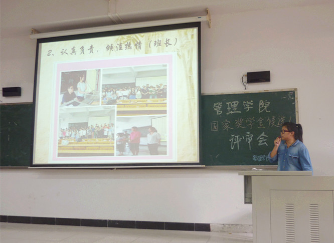 主持人介绍完评审会流程,大会正式开始。本次国家奖学金评审会主要以选手展示PPT的形式进行,共有十位评选人参与角逐。每位选手按序号上台,要求在5分钟内讲解完毕。各个评选人都满怀自信,愉悦地和大家分享自己过去在学业、品行以及文体等各方面的优秀表现以及心得体会。选手们综合测评位居榜首的骄人成绩,无数比赛活动所获得的荣誉奖项,丰富深刻的社会实践经历等,都在一张张幻灯片中呈现,充分展现出南国管院学子的风采。