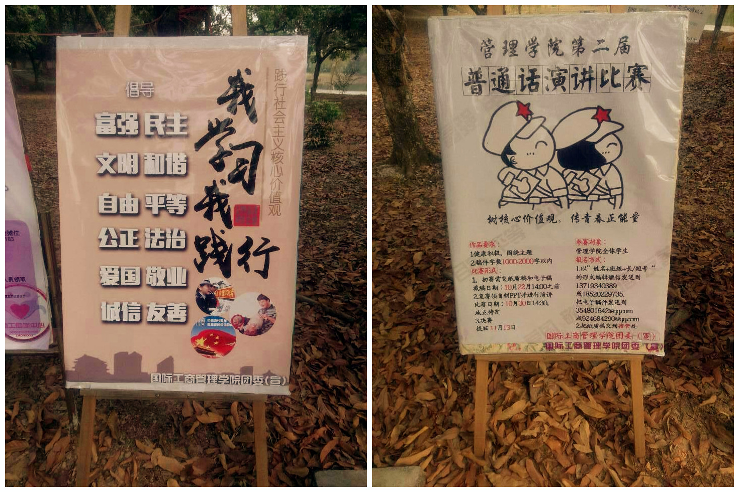 首先,管理学院团委通过平面海报展示社会主义核心价值观的基本内容:富强、民主、文明、 和谐、自由、平等、公正、法治、爱国、敬业、诚信 、友善。简洁明了的海报不仅给同学们带来视觉上的猛烈冲击,同时让同学们易于铭记社会主义核心价值观的基本内容。
