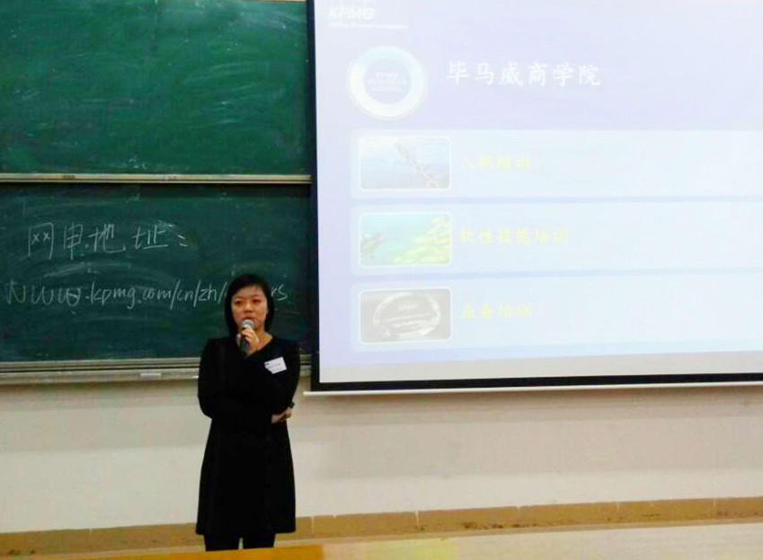 本网讯 12月23日下午,毕马威会计事务所服务中心在教学楼C401举行实习招聘宣讲会。毕马威服务中心审计部高级经理龙经理、人力资源部梁经理、经理助理王助理为我院会计专业学生进行演讲,我院党总支副书记卢少勇、实践教学中心主任肖菁出席了本次宣讲会。
