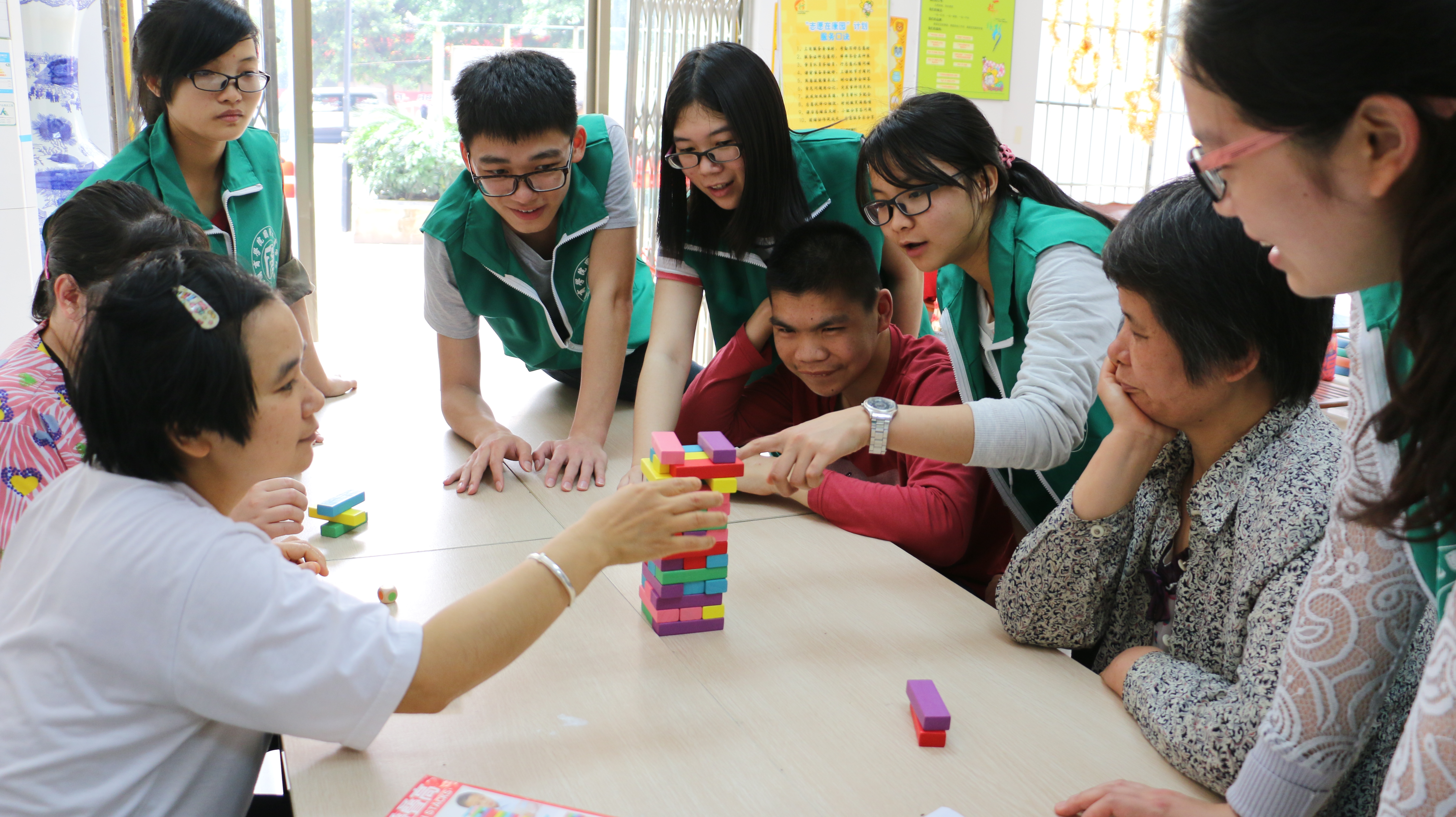 活动伊始,志愿者们带领工疗站的学员们跳舞,舞蹈的动作虽然简单,但也能帮助大家活动身体。舞蹈过后,继续开展了一系列娱乐活动:部分志愿者在室外与学员玩“老鹰捉小鸡”、打羽毛球;而其余的志愿者在室内与学员聊天等。紧接着,还陆续进行了拆积木和纸筒传递的游戏,让大家更好的相互了解。活动期间志愿者们与学员们交流不断,整个过程有序而欢乐。