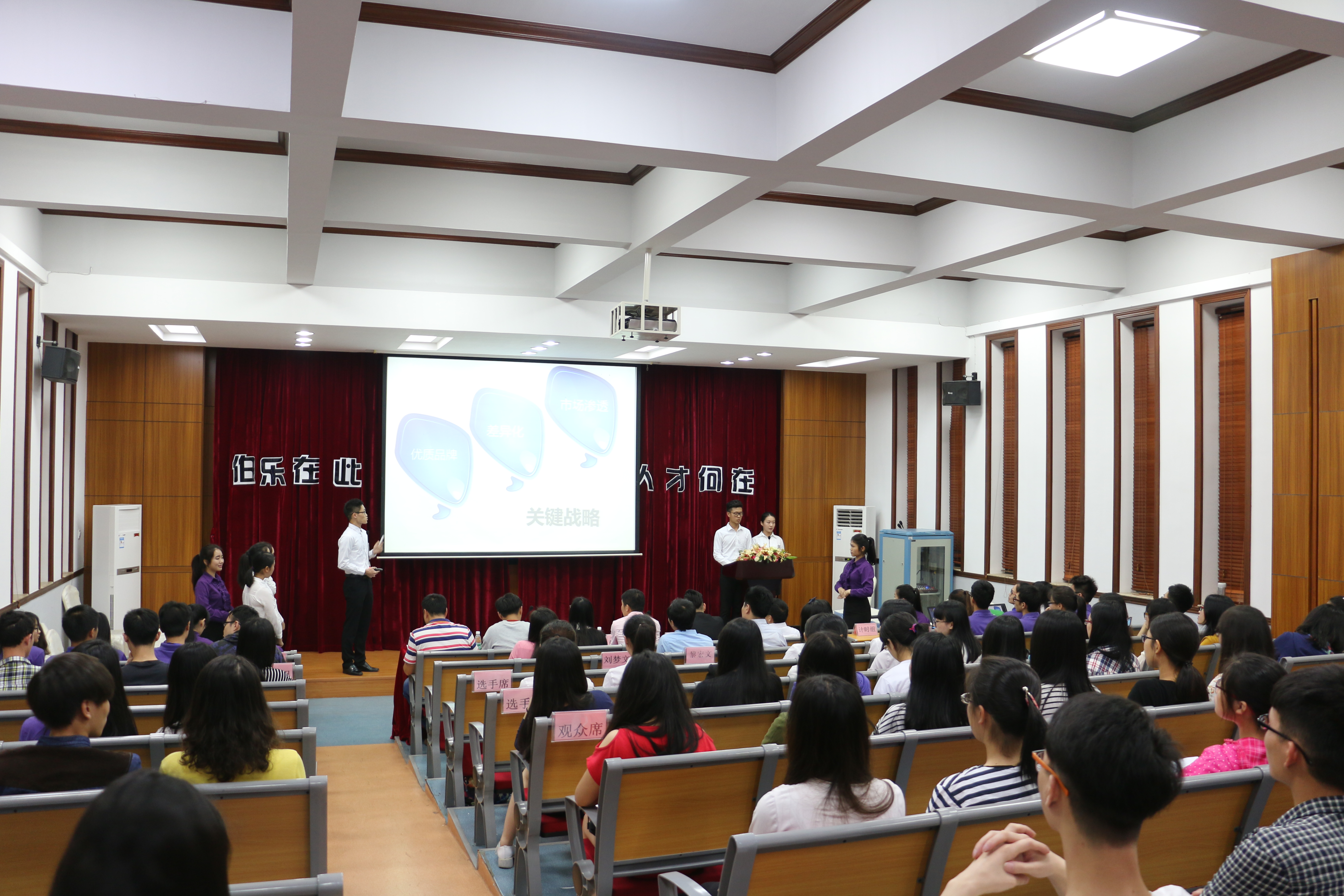 在一开始的团队展示环节,三个小组分别以《京东商城公司的分析》、《华为公司的分析——如何攻占中国高校市场》、《优衣库公司的分析》为研究课题,采用具体分析法向评委及观众讲解该公司的优势、劣势、发展潜力及未来展望等内容,展示了他们出彩夺目的团队合作能力。