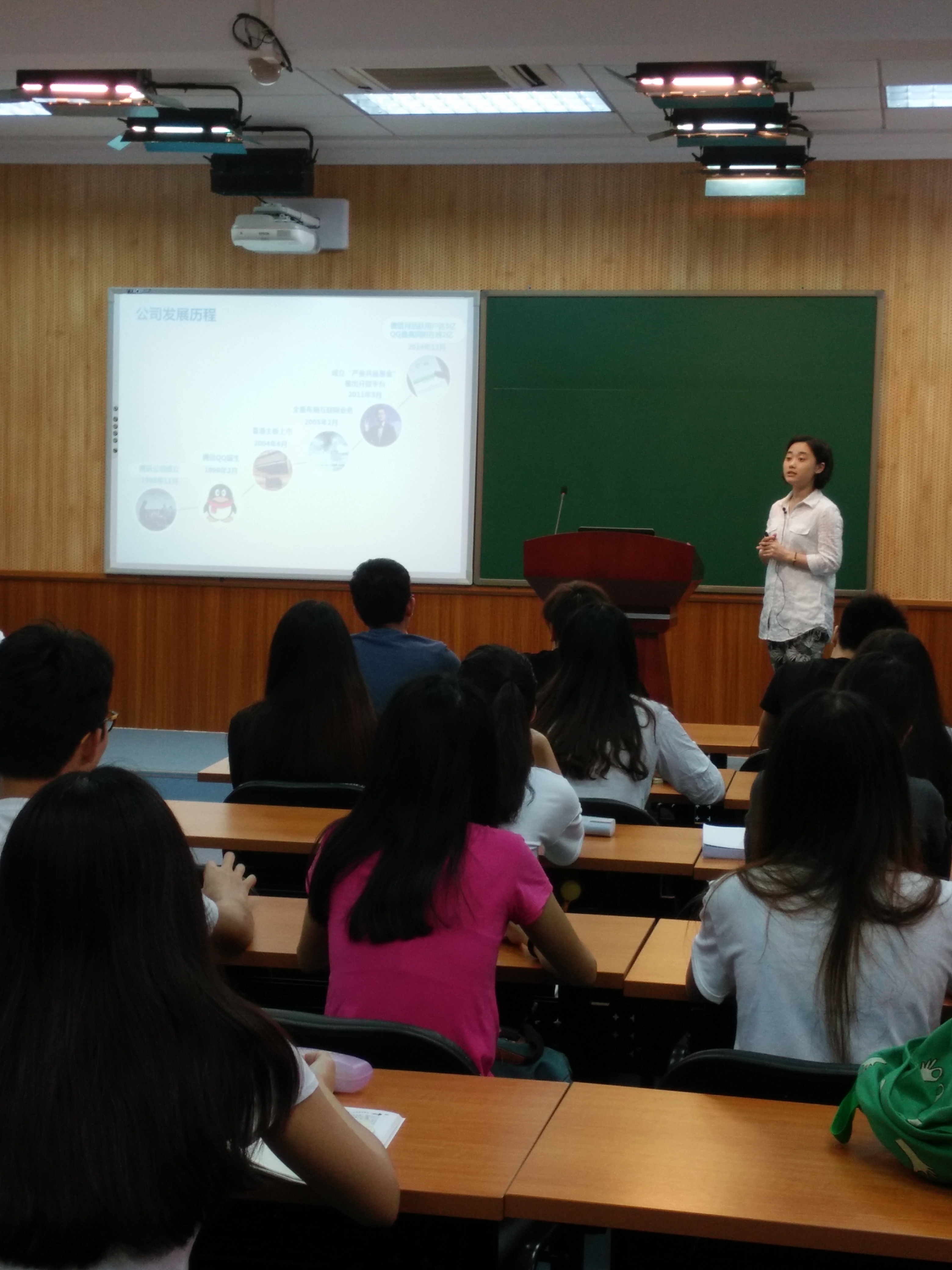 分享会伊始,Vicky风趣幽默又不失专业性的开场,顿时引起了同学们浓厚的兴趣。她就腾讯及腾讯人的故事简单地介绍了腾讯公司的背景、现状以及未来的发展方向。Vicky着重介绍了腾讯公司的一些成功的为大家所熟知的企业活动,例如:春晚摇一摇红包,微信支付等。期间还穿插了有奖竞答环节,增加了与同学们之间的互动,积极地调动了分享会的气氛。