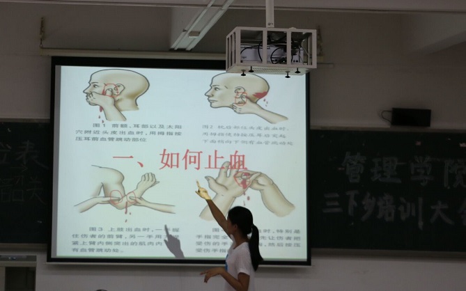培训会伊始,主持人先向志愿者们介绍两间学校的详细情况,播放上一年志愿者三下乡活动视频,让志愿者了解在三下乡期间的日常工作。随后,由管院团委社会实践部部长裴艳云对志愿者们进行急救培训,详解各种突发状况,并上台演示重要部位受伤时应采取的紧急措施,以提高志愿者的急救能力。紧接着是由上一年的队长们上台向大家分享经验。廖璟瑞通过精心准备的PPT让志愿者们更详尽地了解支教生活;欧嘉烨则强调“你有队友”这一句话,告诉志愿者们应该团结友爱。